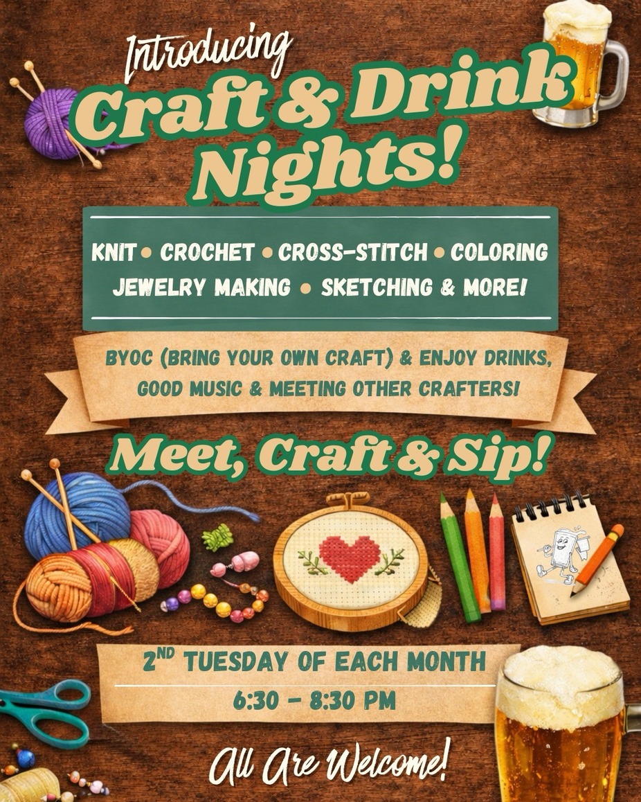 Craft and Drink Night at Humble Pour is a relaxed monthly gathering for anyone who enjoys making things with their hands while spending time with good company. Whether you knit, crochet, sketch, bead, paint, journal, or work on any other creative project, this is a place to bring your craft, grab a drink, and settle in for an easygoing evening.